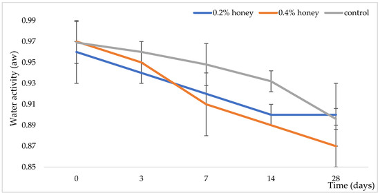 As shown in Figure 1, the water activity (aw) values of the sausage varieties decreased over time. However, a noticeable difference was observed between the sausages with 0.2% and 0.4% honey. Specifically, the aw value was lower in the sausage with 0.4% honey, while the sausage with 0.2% honey exhibited better aw values compared to the control sausage at the end of ripening. This decrease in aw is primarily attributed to the moisture content (see Table 1).