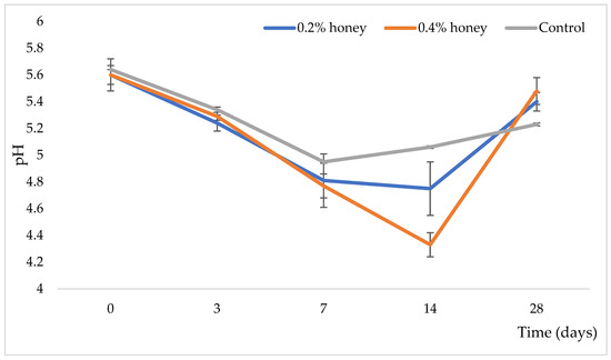 The different percentages of honey in the sausages did not significantly affect the pH values (Figure 2). During ripening, the pH decreased moderately, reaching its minimum on the 14th day of the process. Notably, on the 14th day, the pH value was lower in the sausage with 0.4% honey. All tested samples exhibited a decrease in pH until the 14th day, with sausages containing honey being more acidic compared to the control sausage. After this point, the pH values began to rise in all sausage varieties. However, by the end of the ripening period, the pH remained lower in the control sausage compared to those with honey.