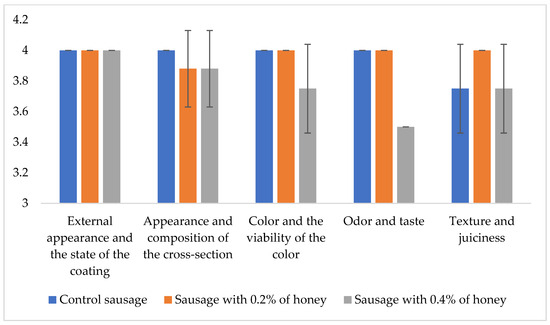 The sensory panel results, presented in Figure 3, show that the addition of 0.4% honey significantly influences the sensory characteristics of the sausages, particularly in terms of color vibrancy, odor, taste, texture, and juiciness. Sausages with 0.2% honey displayed favorable sensory properties, closely resembling Sokobanja sausage. The trained sensory panel noted that these sausages had better texture and juiciness compared to the other two variations tested.