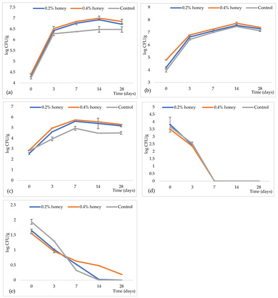The total viable LAB (Figure 4b) rapidly increased until the 14th day of ripening in all three tested varieties, reaching 7.47 log CFU/g in the control sausage, 7.56 log CFU/g in the sausage with 0.2% honey, and 7.73 log CFU/g in the sausage with 0.4% honey. By the 28th day of ripening, the number of LAB slightly decreased, but it remained higher in the sausage with 0.4% honey.