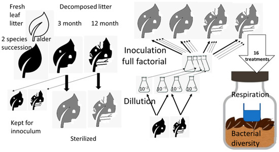 Scheme of the experimental design. The experiment was conducted with two types of litter; however, for simplicity, the workflow in the figure is depicted in detail only for one type of litter; for other types of litter it would be identical. Likewise, each combination of litter age and dilution was inoculated with sterilized leaf litter substrates of conspecific litter in both ages to obtain the full factorial combination for each litter type. This brings 2 sources of inoculate × 2 dilutions inoculated into 2 substrates of different ages, which means 8 treatments per litter type and 16 treatments in total. Each treatment was the subject of respiration measurement and bacterial diversity characterization.