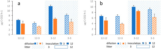 Average microbial respiration in (a) alder leaf litter treatments and (b) successional leaf litter treatments. The first number shows the age of the substrate (3-month or 12-month-old substrate), the second number shows one of the 3- or 12-month-old substrates from which the inoculum was drawn. Blue bars show the less diluted samples (10−2) and orange bars show the more diluted sample (10−5) while shagreen refer to inoculation source, hatched for three months old substrate solid for 12 months old substrate, in both dilutions, i.e., both colors. Corresponding three-way ANOVA results are summarized in Table 1.