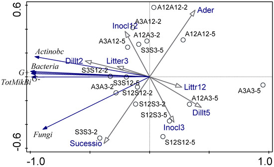 The obtained data were modified in Microsoft Office Excel and statistically evaluated in the Statistica program (TIBCO®, version 13.3; Software for Statistical Computation; USA). To assess respiration at different substrate and inoculation levels at their interactions for each litter category, and to classify the homogeneous groups and significant differences between treatments, we used three-way analysis of variance (ANOVA) followed by a Fischer LSD post hoc test. The interactions between and variability in treatments were visualized by means of principle component analysis (PCA, [40]). Nonlinear multidimensional scaling (NMDS) was used to illustrate the community variability in response environmental variables without direct testing of individual variables. Parameter stress indicating the discrepancy between the original distance matrix and distances is also displayed in the ordination diagram. NMDS was conducted with the Canoco 5 software [41].