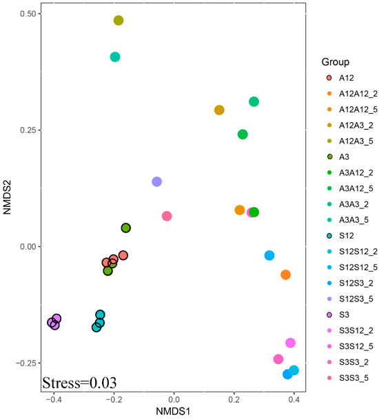 NMDS of the OTU composition of the microbial community. The first letter shows the age of the substrate (old, 12-month substrate or young, 3-month substrate); the second letter shows the inoculation from one of young or old substrates. A is the alder litter treatment and S is the successional litter treatment.