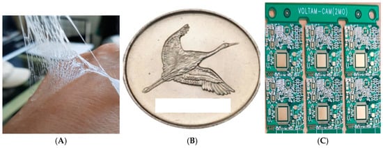 (A) A synthesized mimic skin tattoo film, (B) a 28 mm diameter coin like in C, and (C) a voltametric wearable WiFi workstation circuit with a coin size like that of B. Diagnostic COVID-19 antibody spike proteins are only responded to by antigen protein receptors.