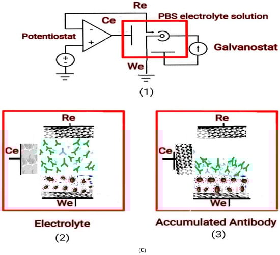 Figure 3A shows an antigen mimic synthetic DNA sequence, where a 4-type mixed molecule was used as the working electrode immobilization paste. Figure 3B shows the working probe. It shows the overall schematic diagram of a multi-layer schematic image. The first layer is graphene powder, then the human DNA mixed platinum and COVID-19 antigen-immobilized activation layer, and the antibody redox titration current amplifier circuit is shown in Figure 3C. Figure 2C shows the circuit of the voltametric reaction cells, where (1) is the PBS electrolyte inserting skim, with a 5 mL solution buffer and (2) is the antibody 0.2 µL blood positive serum spike. Then, the cyclic voltametric accumulation time absorption skim is shown in (3), which includes the simulated antigen antibody molecular ionic redox titration skim. Under optimum conditions, the anodic and cathodic peak current obtained range within 1.0 × 10−5 A~1.0 × 10−7 A; more amplified signals can be obtained by using a stripping accumulation time with 1.0 × 10−8 A~1.0 × 10−9 A. The results can be used for in vivo or vitro detection.