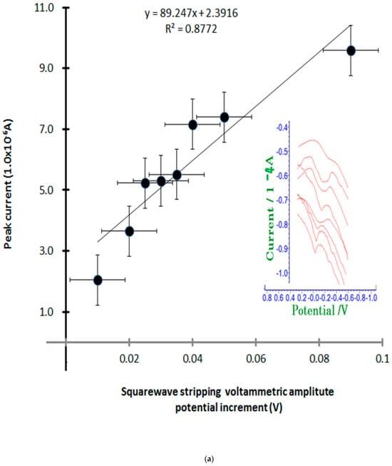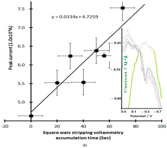 (a) Stripping voltametric anodic amplitude variation from 0.01 V to 0.09 V with eight intervals using 30 s accumulation time in 0.9 mL antigen spiked with PBS electrolyte constant; (b) stripping accumulation time variation from 0 s to 70 s with 7 intervals of anodic scanning, using (A) solution under same condition.