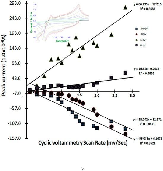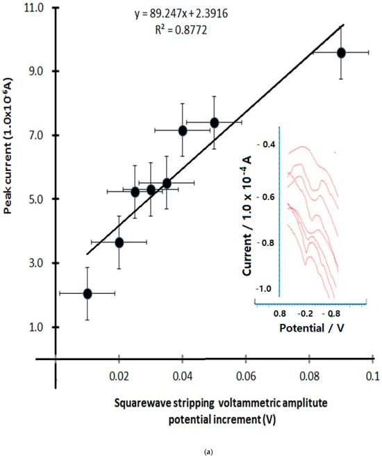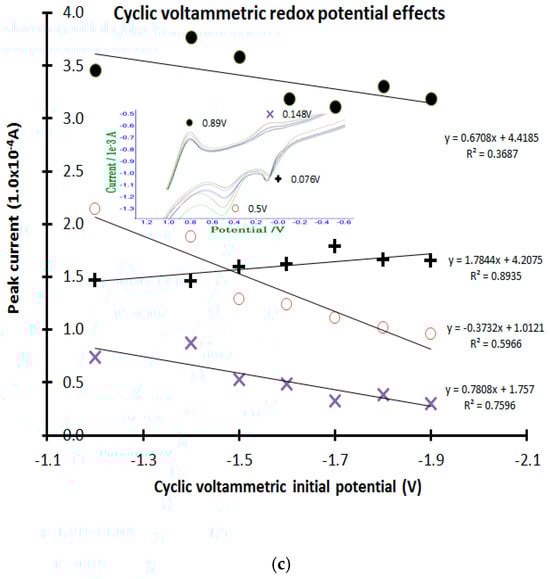 Figure 4a shows the analytical COVID-19 antibody cyclic accumulation time variations. Here, the results are related to the concentrated ionic activity, so a 13-step sequential peak current was examined. Then, it was combined with the inserted voltammograms, −2.0 V initial, 2.0 V feedback cyclic scanning, −0.2 V anodic, and 0.8 V cathodic peak current, obtained with 0.9 mL antibody-containing PBS electrolyte. During the 20~140 s accumulation time with redox scanning, the anodic peak is −0.1989 × 10−6 A~−16.15 × 10−6 A at −0.2 V potential windows, and R2 = 0.9005 is sensitive; also, the 0.8 V cathodic peak is 0.4848 × 10−6 A~−1.156 × 10−6 A, and a current appeared, for which the relative standard deviation R2 = 0.0129 is sensitive. Under these conditions, cyclic scan rate variations were examined. The results shown in Figure 4b for 0.1 mV/s~2.8 mV/s, with 25 step variations show that under optimum conditions, two peaks of anodic current for −0.01 V = −3.263 × 10−6 A~−124.7 × 10−6 A and −0.3 V = −1.362 × 10−6 A~−141.6 × 10−6 A appeared; here, the relative variation errors are shown to be inserted in the voltammograms. Also, cathodic peak obtained has two peaks. Figure 4c shows the cyclic scan rate variations of the initial potential within −1.2 V~−1.9 V; also, +0.076 V and +0.5 V oxidations appeared and +0.89 V + 0.148 V reduction peaks were obtained. Here, the linear equation for the +0.076 V oxidation peak is y = 0.7808X + 1.757, R2 = 0.7596; for the +0.5 V peak, it is y = −0.3737X + 1.01212, R2 = 0.5966; for the 0.89 V reduction peak, it is y = 1.7844X + 4.2075, R2 = 0.8935; and for 0.148 V, it is Y = 0.6708 + 4.4185, R2 = 0.3687. Then, stripping voltametric optimization was performed.