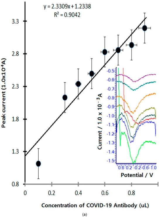 The stripping voltametric differential is dramatically increased by the sensitivity of ion titration. Therefore, only the following functions with the greatest influence were optimized, such as accumulation time change, current amplification rate, and redox titration. Figure 5a shows the results of the anodic stripping current amplitude variations with eight points, 0.01 mV, 0.02 mV, 0.025 mV, 0.03 mV, 0.035 mV, 0.04 mV, 0.05 mV, and 0.09 mV. In the real voltammograms shown in this figure, the sensitive linear current was increased from 2.024 × 10−6 A to 9.591 × 10−6 A, the linear equation is Y = 89.247X + 2.3916, and the relative standard deviations is R2 = 0.8772, so the optimum amplitude obtained is 0.06 mV. Under these conditions, anodic scanning time variations were examined at 0 s, 20 s, 30 s, 40 s, 50 s, 60 s, and 70 s, for which the voltammograms are shown in Figure 5b. The first peak is 4.637 × 10−6 A, which then linearly increases to 7.528 × 10−6 A; here, the working equation is dx/dy = 0.0334x, the intercept is 4.7259, and the anodic peak potential is fixed at −0.2 V. For these results, the optimum conditions obtained were at 30 s under these conditions. The final optimum conditions will affect the detection limits of the virus investigated, and thus the concentration spike was assessed according to mg~ug variation. The results show only the working curves and anodic scanning; analytical sensitivity comparisons for SARS-CoV-2 are shown in Table 2. The analytical limits of detection for seven SARS-CoV-2 assays using serial dilutions of pooled patient material quantified with droplet digital PCR are shown. Limits of detection ranged from ≤10 to 74 copies/mL for commercial high-throughput laboratory analyzers [24] and from 167 to 511 copies/mL for sample-to-answer [24] and point-of-care instruments (Abbott ID NOW). However, our developed method reached a detection limit of 10 µL, which is more sensitive than that of common methods [25].