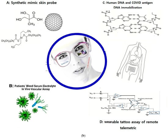 Using the final optimized stripping parameters, Figure 6a shows the effects of antibody concentration with 9-step spiking. The anodic scan with oxidized electric titration is shown in Figure 6; the first spike was added to 0.1 µL antibody in PBS electrolyte without any ion, with an obtained current of 1.113 × 10−4 A with 0.0 V potential windows. In the oxidized voltammogram, a small peak appears. With continued 0.3 µL~0.5 µL spiking, a 2.217 × 10−4 A~2.494 × 10−4 A peak current was obtained under this conditions. Figure 6b shows the oculus glass monitoring of in vitro and in vivo linking for applications such as synthetic artificial skin application. A paper was published on the synthesis of a water-dispersed human-friendly transparent skin sensor. It was synthesized at room temperature using graphene conductive carbon crystals, propylene hydrate, ethyl alcohol solvent, a soft reaction accelerator, and a room-temperature hardener. In vitro coating was used for skin tattooing and it was used as a three-electrode system. It was used as a voltage and current measurement sensor to amplify the signal of the antigen–antibody oxidation reaction. These sensors were suitable for disease diagnosis, virus diagnosis, heavy metal diagnosis, and biological signal amplification. It was possible to diagnose in vivo blood, urine, and body fluids within the human body. The micro sensor could be inserted into muscles, blood vessels, and organs without pain. Therefore, nerve signal detection, pain diagnosis, blood sugar assay, sound wave diagnosis, and joy, anger, and sorrow diagnosis are possible. Nerve current amplification can be linked to a remote unmanned control system. It can be linked with oculus glass monitoring. Therefore, multi-tasking and multi-user operations can be controlled. Figure 6b shows antigen–antibody diagnosis in the body. Antigen electrodes, antigen sensors, and signal amplification for in vivo virus diagnosis are possible. Therefore, virus amplification diagnosis at milli, micro, nano, and pico concentrations is possible. Additionally, an injection of cell-killing water is possible without organ damage. Linkage between voltammetry diagnostic equipment and oculus monitoring is possible. Therefore, wearable self-diagnosis sensors, self-treatment, unmanned diagnosis, drug injection, remote diagnosis treatment, etc., are possible. In addition, real-time human body information can be transmitted, enabling linkage with emergency treatment, micro-nano surgery, etc. The attached circuitry is a partial drawing designed by our laboratory. It was designed with two CPUs, an amplifier, memory, and WiFi transmission circuit. It is possible to convert more than 80% of ions in the periodic table at a cyclic redox voltage in the range of −2 v to 2 v. The ion potential can be amplified from milli to pico. Calculus-enabled 2D plane control is possible. Therefore, quantitative and qualitative methods can be performed. Nanopicomolar amplification of ion analysis is possible. The overall size of the circuit board ranges from the size of a coin to the DC power source. Therefore, we were able to design diagnostic equipment and sensors suitable for a wearable tattoo system.