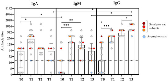 Anti-OPXV IgA, IgM, and IgG antibody titers at different time points after the SO. The bars represent the medians and IQRs for all the patients, while the scattered plots show individual measurements. The red, orange, and dark red plots represent the antibody titers of patients who reported a history of smallpox vaccination. The light blue plots represent values obtained from the asymptomatic subjects. The dashed line represents the threshold for the limit of detection (based on the screening dilution) for the antibody titer. Non-smVAC HD subjects presented an antibody titer ≤ 1:20. Comparisons were made using the Wilcoxon signed-rank test for paired data with a false discovery rate correction (fdr). Significant differences were represented as follows: * p ≤ 0.05, ** p ≤ 0.01, and *** p ≤ 0.005.