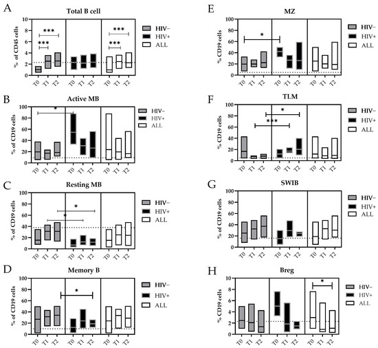 Changes in the B-cell subpopulations during the MPXV infection. Floating bars represent the median and min and max frequency values of each B-cell subpopulation regarding the CD19+ cells. The dashed lines represent the median value obtained from HDs. The white bars represent all mpox subjects included in this study, the gray bars only the HIV− subjects, and the black bars the HIV+ subjects. Statistical differences between the groups were determined using the Wilcoxon rank-sum test. Significant differences were represented as follows: * p ≤ 0.05, and *** p ≤ 0.005. Cells were indicated as: (A) Total B cells (CD19+); (B) Active MBs (B): Active memory B-cells (IgD−/CD27+/CD21−); (C) Resting MBs: Resting Memory B-cells (IgD−/CD21+/CD27+); (D) Memory Bs (IgD−/CD27+); (E) MZ: marginal zone (CD27+/IgD+); (F) TLMs: tissue-like memory B-cells (CD21−/CD27−); (G) SWIBs: Switched B-cells (CD27+/IgD−/IgM−); (H) B regs: B regulatory B-cells (Cd19+/CD24 high/CD38 high).