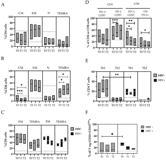 The changes in T-cell subpopulations during the MPXV infection were described in panel (A–F). The floating bar represents the median and min and max frequency values of each T-cell subpopulation in relation to the time point after the SO and the HIV coinfection. The dashed line represents the median value obtained from the HDs. Statistical differences between the groups were determined using the Wilcoxon rank-sum test. Significant differences are represented as follows: * p ≤ 0.05, ** p ≤ 0.01, and *** p ≤ 0.005. T-cells are indicated as N: Naive (CD45RA+ CCR7+); CM: Central Memory T-cell (CD45RA− CCR7+); EM: Effector Memory T-cell (CD45RA− CCR7−); TEMRA: Effector Memory-expressing CD45RA T-cell (CD45RA+ CCR7−) in both CD4+ and CD8+ populations; Th1: T helper cells (CD4+) type 1; Th2: T helper cells (CD4+) type2; and Treg: T regulatory T-cell (CD25+/CD127 low).