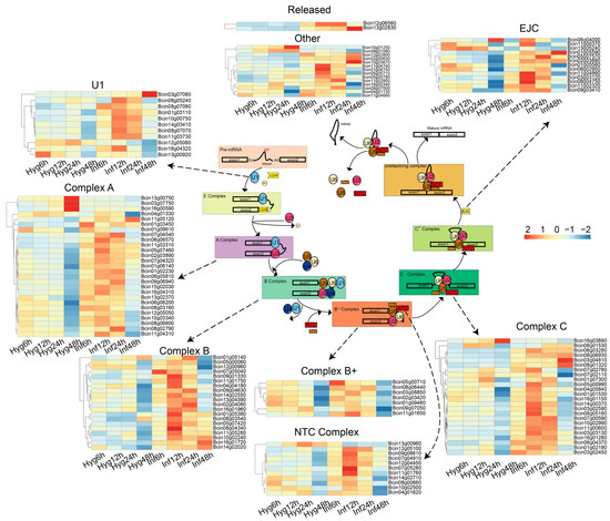 We utilized RNA-seq reads of B. cinerea cultured in vitro on potato dextrose broth (PDB) to examine the transcriptional regulation of the spliceosome components during four consecutive infection stages (Figure 1). We found that 129 spliceosome-related genes expressed more than 10 TPM (Transcripts per kilobase million) in at least one stage, except Bcin01p03450 (Complex A, encoding U2-related factor). Surprisingly, many spliceosome components exhibited high expression during the infection, especially at key nodes (12 h and 24 h) where the fungus infects the host (Figure 1). Among the 129 genes, 104 genes were upregulated in at least one infection stage, and 44 genes (p-value < 0.05 and log2 fold change ≥1) were differentially upregulated. For instance, Bcin10g03670 demonstrated a remarkable increase in expression, rising 113-fold at 48 h during the infection stage compared to the vegetative stage (Table S3). These results suggested that the spliceosome components are specifically highly expressed during the infection stage.