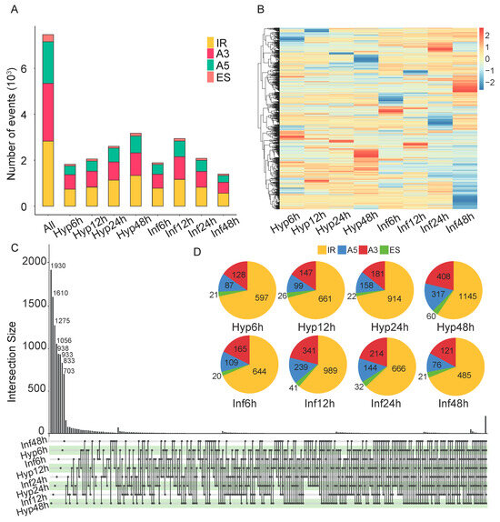 Across all samples, we identified a total of 7466 alternative splicing events in 3308 genes (Figure 2A). There are four major types of alternative splicing, including intron retention (IR), alternative 5′-donor (A5), alternative 3′-acceptor (A3) and exon skip (ES). The most abundant alternative splicing event is IR, followed by A5 and A3, while ES is the least common (Figure 2A). The percent splicing index (PSI) values of alternative splicing events were higher in Hyp48h but lower in Inf24h and Inf48h (Figure 2B). Surprisingly, tissue of Hyp48h has the highest number of specific alternative splicing events, whereas Inf48h has the least amount of specific splicing events (Figure 2C). Importantly, IR is the most frequent specific alternative splicing type among all stages (Figure 2D). Taken together, these results suggest that alternative splicing is extremely stage-specific, especially during the host infection stage in B. cinerea.
