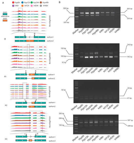 Validation of four types of alternative splicing events across eight stages using RT-PCR. (A) The RNA-Seq read coverage of the four types of alternative splicing events (IR: intron retention, A5: alternative 5′-donor, A3: alternative 3′-acceptor, ES: exon skip) across eight developmental stages (hyphae: Hyp6h, Hyp12h, Hyp24h, Hyp48h; infection hyphae: Inf6h, Inf12h, Inf24h, Inf48h) is presented. Eight distinct colors represent the different stages. Below each alternative splicing event, the corresponding transcript is displayed, with green indicating constitutive exons and orange denoting alternative exons. PCR primers (F for forward and R for reverse) are designed to flank the alternative exons. (B) RT-PCR validation was conducted on the four types of alternative splicing (AS) events at the marked loci, utilizing RNA isolated from hyphae and infection hyphae. The left side of the gel displays the sizes of the DNA markers, while the right side presents the gel bands. The dashed line box highlights the regions where alternative splicing occurs.