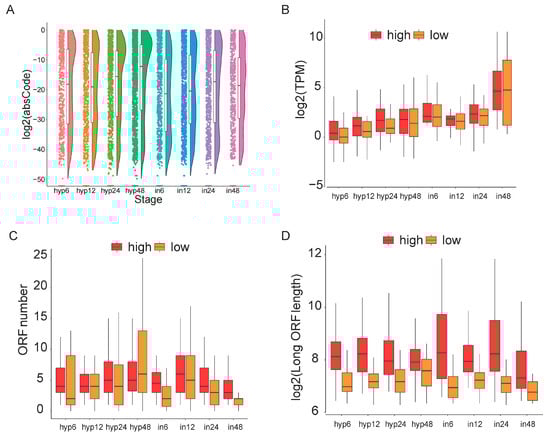 The pre-mRNAs can also undergo alternative splicing to generate more than one protein-coding mRNAs from a gene. To explore changes in the coding capacity of transcripts after alternative splicing, the multiple coding potential indicators of transcripts were analyzed. Firstly, we compared the coding ability of the two isoforms generated by alternative splicing from one gene. In the hyphal stage, the coding capacity among transcripts produced by alternative splicing was generally greater than in the infection stage (Figure 4A). The expression levels of transcripts with high coding potential were generally higher than those of transcripts with low coding potential in all stages (Figure 4B). The following analysis results also showed that transcripts with high coding potential had higher number and length of open reading frames (ORFs) than transcripts with low coding potential (Figure 4C,D).