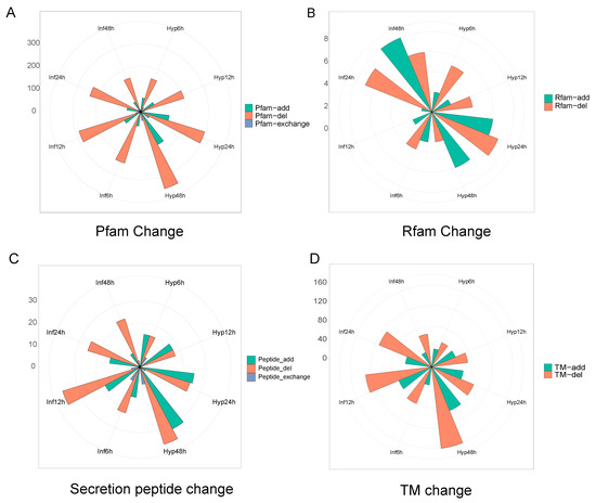 Furthermore, we explored the changes in functional domains between transcripts generated by alternative splicing. Using high coding potential transcripts as controls, we compared isoform structural changes resulting from alternative splicing, which were divided into three types: domain increase, domain decrease, and domain exchange. Compared with transcripts with high coding potential, transcripts with low coding potential produced by alternative splicing at all stages have mostly lost protein domains (Figure 5A). Compared with changing the number of protein families (Pfam), alternative splicing affects the number of RNA families (Rfam) much less (Figure 4B). Except for the Hyp48 h, Rfam reduction was the predominant type among transcripts with low coding potential (Figure 4B).