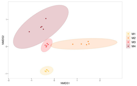 Non-metric multidimensional scaling (NMDS) of biofilm bacterial communities from the control condition sampled each month (M1 to M4). Ellipses were drawn at a 99% confidence level for a multivariate t-distribution. Stress value: 0.04631038.
