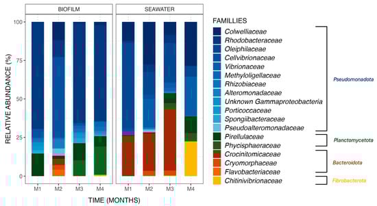 Relative abundance (%) of the major ASVs found in biofilm and seawater samples in the control condition at each sampling month (M1 to M4). ASVs are represented at the family taxonomic rank. Together, the ASVs shown here comprise 99.6% of all observed ASVs.
