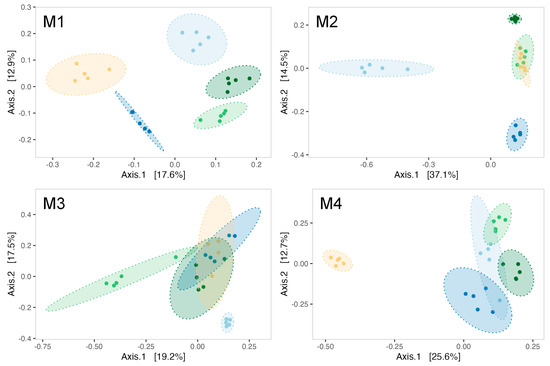 Principal coordinate analysis (PCoA) using Bray–Curtis distance for biofilms formed at every month of the experiment (M1–M4). Ellipses are drawn for each experimental condition (light blue = CTL, dark blue = RA15T, light green = hOe-125, dark green = hCg-42, yellow = 3J6) at a 95% confidence level for a multivariate t-distribution.