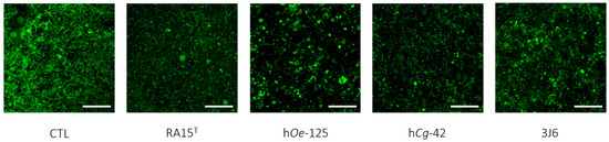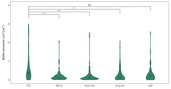 Indeed, as an average for the whole experimentation, a mean biovolume value of 0.776 ± 1.145 µm3/µm2 was obtained for the control condition. The mean biofilm biovolume value was significantly reduced for three Pseudoalteromonas strain treatments of 0.221 ± 0.331 µm3/µm2 (RA15T), 0.230 ± 0.429 µm3/µm2 (hOe-125), and 0.310 ± 0.409 µm3/µm2 (hCg-42). However, the 3J6 strain treatment showed a non-significant biovolume reduction with a mean value of 0.328 ± 0.459 µm3/µm2. These analyses were determined from biofilm images taken by CLSM (Figure 7).