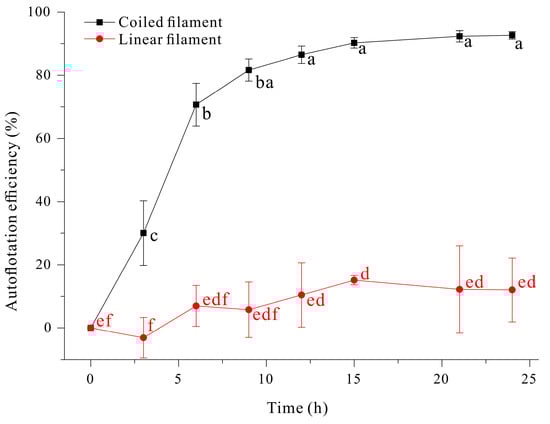 3.6. Auto-Flotation Efficiency of Linear and Coiled Filaments