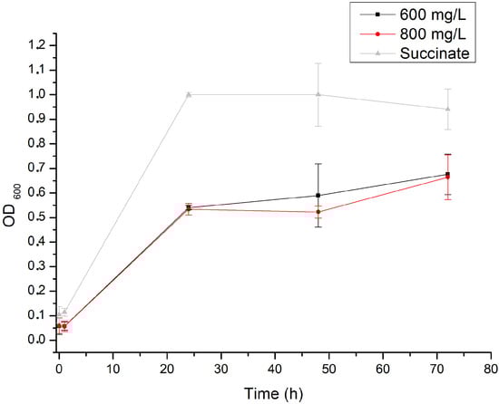 To investigate the effects of different concentrations of phenol on bacterial growth, Pseudomonas sp. phDV1 was cultured in M9 minimal medium supplemented with 600 or 800 mg/L phenol as the sole carbon source, respectively. Cell growth was monitored by measuring the OD at 600 nm for 72 h (Figure 1). The results showed that Pseudomonas sp. phDV1 was able to degrade phenol at concentrations up to 800 mg/L, which is the highest concentration compared to other studies []. As shown in Figure 1, the growth rate of the strain was similar at both concentrations of phenol. Furthermore, the maximum cell density was observed at the stationary phase in all phenol concentrations.