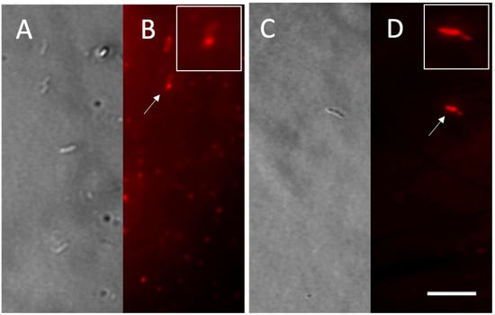 Accumulation of PHB in Pseudomonas sp. phDV1 strain. (A,C) Optical microscopy of Pseudomonas sp. phDV1 grown in 6.4 mM and 8.5 mM phenol, respectively. (B,D) Pseudomonas sp. phDV1 strain expressed fluorescence when stained with Nile Red grown in 6.4 mM and 8.5 mM phenol, respectively. PHB production is seen as red fluorescence. Arrows indicate the cell in the insert. Scale bar represents 5 μm.