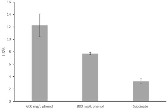To confirm these qualitative findings, the actual concentration of PHB produced by the Pseudomonas sp. phDV1 strain grown in 600 and 800 mg/L phenol, respectively, was quantified by HPLC after 72 h of growth. The highest PHB yields were obtained when 600 mg/L phenol was used as the sole carbon source (Figure 3). Proteomic studies have shown that the carbon source affects the abundance of enzymes that are important for the degradation of phenols and cresols []. Recent comparative proteomic analyses show that the presence of monocyclic aromatic compounds differentially affects the expression of granule-associated proteins and the proteins involved in PHB synthesis []. This observation suggests that PHB production is not correlated with the amount of the carbon source but probably with the abundance of the proteins involved in phenolic degradation and PHB synthesis.