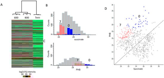 (A) Heatmap showing the hierarchical clustering of all samples. Succ represents succinate whole-proteome samples, with 600 and 800 representing the isolated carbonosome samples from phenol at 6.4 mM and 8.5 mM, respectively. (B) Histograms of the mean distribution of the log2LFQ intensities of the succinate samples. The red represents the distribution of cluster 7 and blue cluster 0, the two clusters of interest. (C) Histograms of the mean distribution of the log2LFQ intensities of the six P(3HB) samples. (D) Scatter plot of the mean log2LFQ intensities comparing the P(3HB) samples against the negative control (succinate) whole-proteome samples.