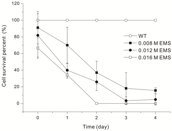 2.2. EMS Treatment, Determination of Cell Survival, and Screening for Mutants