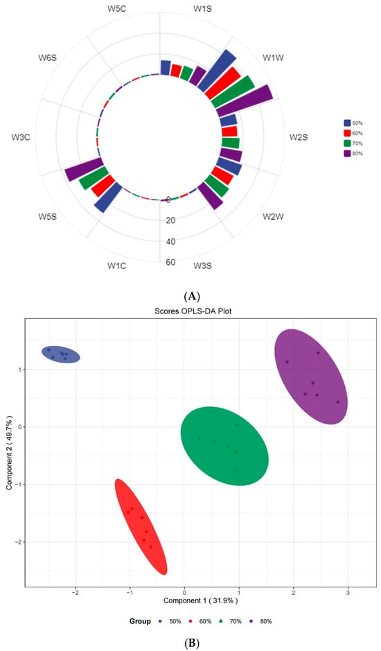 Orthogonal partial least squares discriminant analysis (OPLS-DA) is able to show the differences between and within the sample groups, where the horizontal direction represents the differences between the groups, the vertical direction represents the differences within the groups, and the percentage represents the interpretation rate. Figure 1B shows that alfalfa silage samples with different moisture contents have obvious separation among groups and relatively large aggregation within groups, indicating that there are significant differences in odor among groups and small differences within groups (R2X = 0.916, R2Y = 0.985, and Q2 = 0.952; the model was fitted with high accuracy). Among them, the 50% group, 60% group, and 80% group were far distributed, indicating that the odor characteristics of low-moisture-content and high-moisture-content alfalfa silage were different. The results of the OPLS-DA S–plot of response intensity show that the odor substances corresponding to W1W, W2W, W1S, and W5S sensors contribute more to alfalfa silage.