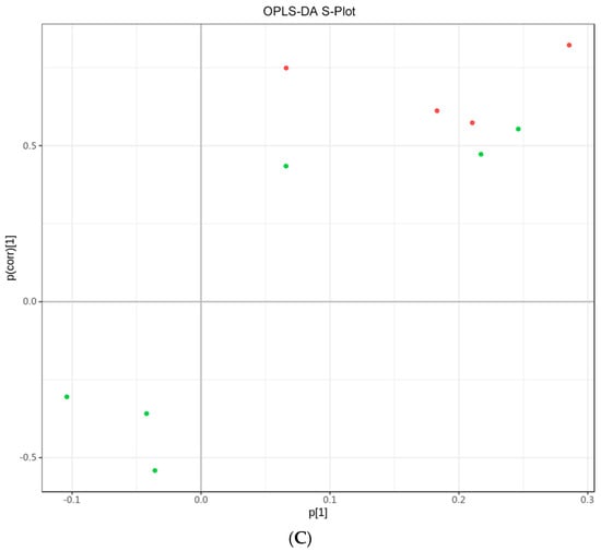 Radar plots of response intensity for each group (A). OPLS-DA score plot of response intensity (B). OPLS-DA S-plot of response intensity (C). Each point represents a substance (metabolite/protein/gene, etc.). The closer the two corners, the more important the variable; the red point indicates the VIP value of the substance >1, and the green point indicates the VIP value of the substance <1.