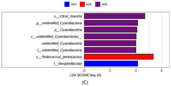 The composition and relative abundance of bacteria at the phylum level is shown in Figure 2A. The relative abundance of Firmicutes and Proteobacteria was higher in all groups, where the abundance of Firmicutes was highest in the 60% group, followed by the 70%, 50%, and 80% groups, in descending order. The relative abundance of Proteobacteria in the 50% and 80% groups was higher than those in other groups. The composition and relative abundance of bacteria at the genus level is shown in Figure 2B. The bacterial community was mainly composed of Enterococcus, Pediococcus, Enterobacter, Aerococcus, Weissella, and Lactiplantibacillus. Among them, the relative abundance of Enterococcus was higher in all groups, with the highest value in the 70% group, followed by the 50%, 80%, and 60% groups, in descending order. The relative abundance of Pediococcus in the 60% group was significantly higher than that of other groups, and the relative abundance of Lactiplantibacillus was also higher. The LEfSe analysis results for bacterial composition are shown in Figure 2C. f_Morganellaceae in the 50% group contributed significantly to the difference between groups. s_Pediococcus_pentosaceus in the 60% group contributed significantly to the difference between groups. s_Citrus_maxima and p_Cyanobacteria in the 80% group contributed significantly to the difference between groups.