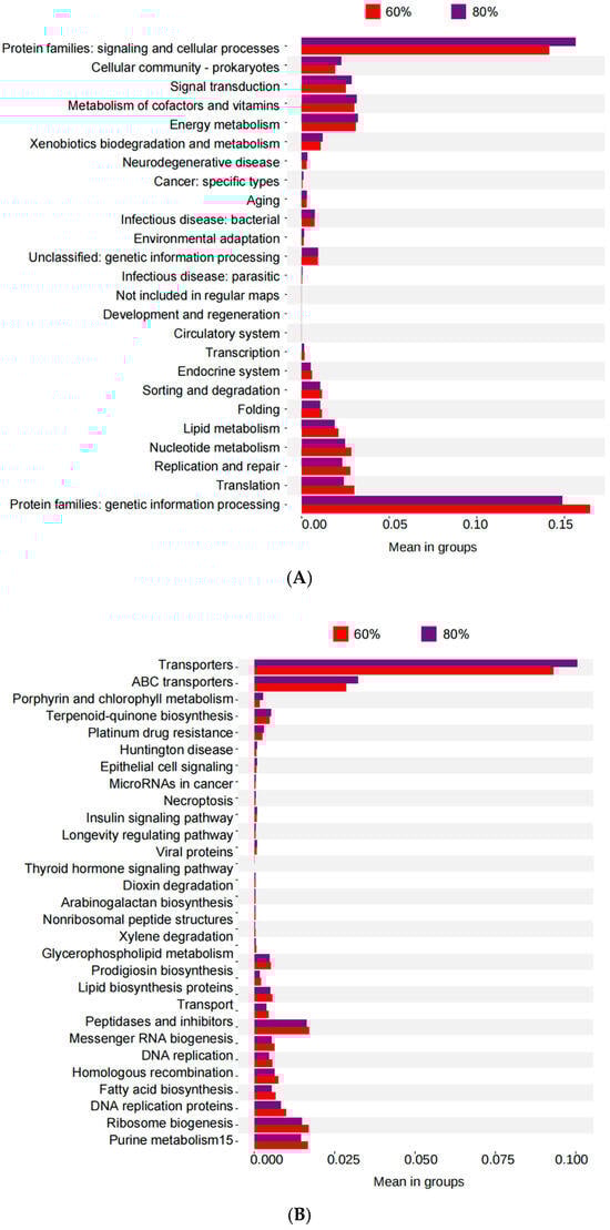 The bacterial function prediction results showed that at the L2 level, the abundance of protein families regarding genetic information processing, translation, replication and repair, and nucleotide metabolism, was higher in the 60% group. The beneficial microorganisms of alfalfa silage with 60% moisture content generally had higher metabolic activity and, therefore, a greater demand for proteins involved in genetic information processing, translation, replication and repair, and nucleotide metabolism. At the same time, the enzyme activity related to genetic information processing and other metabolic processes may be closer to optimal at this humidity level, with better enzyme function and higher fermentation quality [39]. The abundance of protein families regarding signaling and cellular processes, energy metabolism, and metabolism of cofactors and vitamins was higher in the 80% group, which is due to the fact that the growth of corrupt and less efficient fermenting microorganisms requires robust cellular processes to cope with environmental stress, competition, and energy demands, which requires an increase in proteins involved in energy metabolism to meet these increased demands [40]. An increase in water content affects the diffusion rate of nutrients, changes the way microorganisms acquire and use them, and affects the breakdown of organic matter and cellulose, potentially altering fermentation dynamics and leading to changes in microbial metabolic strategies. At the L3 level, the abundance of transporters, ABC transporters, terpenoid-quinone biosynthesis, porphyrin and chlorophyll metabolism, and platinum drug resistance was higher in the 60% group. This is because the silage fermentation process of the 60% group is faster and the microorganisms may need a more active transport system to effectively absorb nutrients and metabolites from the environment, including more types and a higher abundance of transporters and ABC transporters; the transport system, biosynthetic pathways, and stress response mechanisms may also be enhanced [41]. The peptidases and inhibitors, purine metabolism, ribosome biogenesis, DNA replication proteins, and fatty acid biosynthesis were less abundant in the 60% group. Microbial communities with high water content are more diverse and dynamic, requiring enhanced metabolic activity, including purine metabolism for nucleotide synthesis and fatty acid biosynthesis for membrane construction, with increased demand for DNA replication proteins, ribosome biogenesis, and peptidases involved in protein turnover.