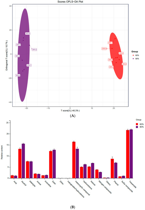 OPLS-DA score plot of VOCs (A). Composition and relative content of VOCs (B).
