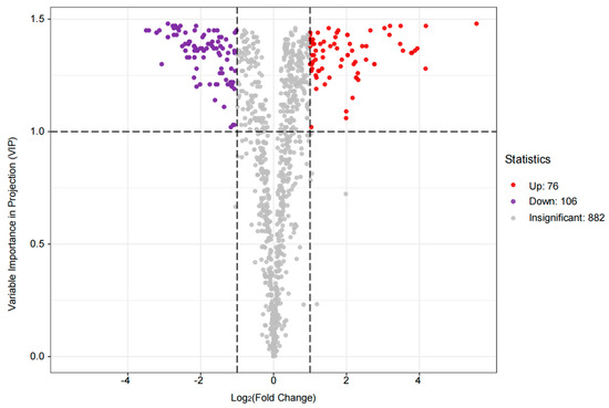 The differences in VOC composition between the two groups were significant. Compared to the 80% group, 76 VOCs were up-regulated, 706 VOCs were down-regulated, and 882 VOCs did not change significantly in the 60% group (Figure 5). The different substances with Fold Chang ≥ 2 or ≤0.5, VIP ≥ 1, and p < 0.05 were selected for analysis; the up-regulated substances were mainly terpenes, heterocycles, esters, and phenols, and the down-regulated substances were mainly heterocycles, terpenes, alcohols, and ketones (Table S1).