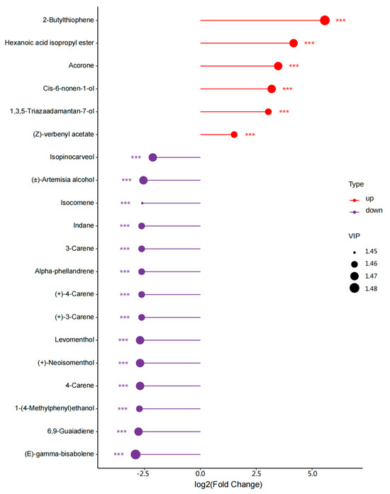 Lollipop map of differential VOCs. The vertical coordinate is the screening substance, the horizontal coordinate is the value of the substance log2FC, the dot size indicates the VIP value of the substance, and *** indicates whether the substance is significant.