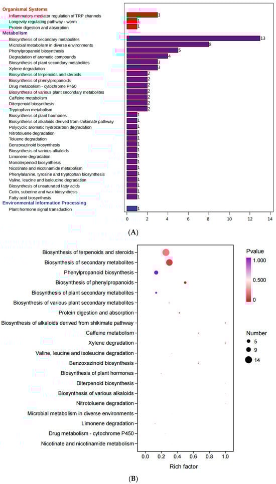 The results of the KEGG annotation of differential VOCs are shown in Figure 7A. The 32 annotated pathways belong to organismal systems, metabolism, and environmental information processing. Among them, the biosynthesis of terpenoids and steroids (13), the biosynthesis of secondary metabolites (8), and phenylpropanoid biosynthesis (5) pathways were more annotated. The KEGG enrichment results of the differential VOCs are shown in Figure 7B. The biosynthesis of terpenoids and steroids, biosynthesis of secondary metabolites, and biosynthesis of phenylpropanoids pathways were enriched for more substances and lower p-values. The phenylpropanoid biosynthesis and biosynthesis of plant secondary metabolite pathways were enriched with more substances.