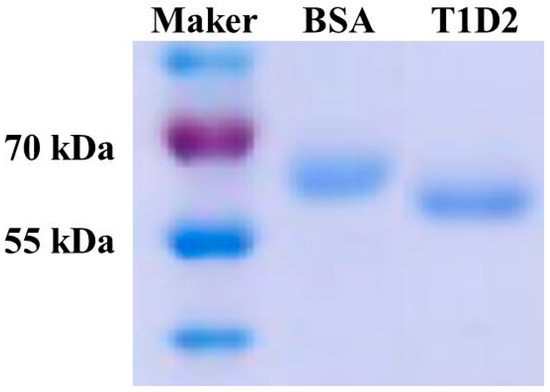 SDS-PAGE analysis of the purified mini-body T1D2. The mini-body T1D2 was expressed and purified using a column with protein G resin. A clear T1D2 band appeared on 12.0% SDS-PAGE using Coomassie blue staining.