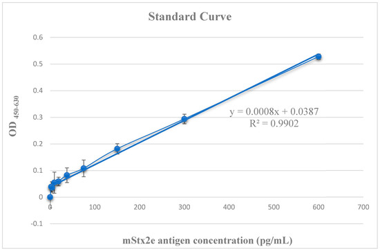 The standard curve of ELISA using T1D2 (T1D2-ELISA) was analyzed using two-fold serially diluted mStx2e antigens at concentrations of 600, 300, 150, 75, 37.5, 18.75, and 0 pg/mL. The standard curve between the O.D450–630 value and concentration of the antigen protein was obtained as follows: Y = 1025X − 30.705, R2 = 0.9836. The lowest detectable concentration for antigen diagnosis was approximately 20 pg/mL. The standard curve is shown in Figure 3.
