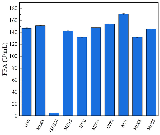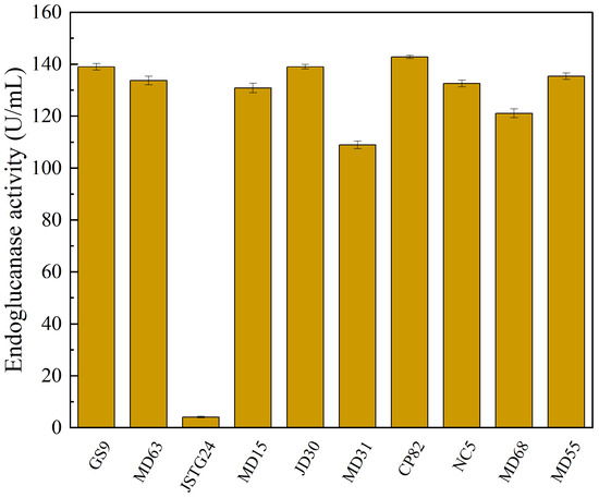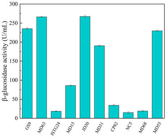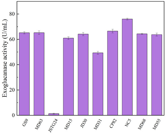 Microbial degradation of straw principally transpires through enzymatic exudation [45]. The strains exhibiting the maximal filter paper activity (FPA) were NC5, CP82, JD30, and MD63, with their corresponding enzymatic efficacies reaching 172.74, 153.77, 151.67, and 151.16 U/mL, respectively (Figure 1). The strains JSTG24, MD68, and MD55 evinced the supreme laccase activity, with their enzymatic intensities being 152.30, 96.40, and 74.00 U/mL, respectively (Figure 2). With regard to xylanase activity, the strains JSTG24, MD68, and MD31 manifested the zenith values, with enzymatic potencies of 712.74, 515.09, and 422.84 U/mL, respectively (Figure 3). NC5, CP82, MD63, and GS9 exhibited the foremost exoglucanase activity, with enzymatic magnitudes of 76.02, 66.52, 65.25, and 65.18 U/mL, respectively (Figure 4). CP82, JD30, GS9, and MD55 harbored the preponderant endoglucanase activity, and their enzymatic intensities were 142.76, 138.99, 138.98, and 135.33 U/mL, respectively (Figure 5). JD30, MD63, GS9, and MD55 demonstrated the preeminent activity of β-1,4-glucosidase, with enzymatic capacities of 267.24, 266.26, 235.28, and 229.58 U/mL, respectively (Figure 6).
