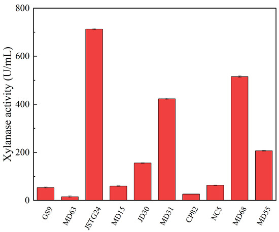 The results of hemicellulose degrading ability (xylanase) of each strain. Error bars are the standard error (n = 3).