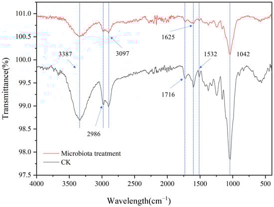 In order to thoroughly understand the impact of microbial communities on the structure and properties of corn straw, we utilized Fourier Transform Infrared Spectroscopy (FTIR) to analyze the chemical changes within the samples of corn straw. Typically, the characteristic absorption peaks of cellulose emerge in regions like approximately 1000–1200 cm−1, 1300–1400 cm−1, and 1600–1700 cm−1 [48]. As illustrated in Figure 8, the absorption peak at 1042 cm−1 corresponded to the asymmetric stretching vibration of the C-O-C bond in cellulose, while the peak close to 1370 cm−1 was associated with the C-H bending vibration of cellulose. The peaks at 3387 cm−1 and 1716 cm−1, respectively, corresponded to the O-H stretching vibration and the C=O stretching vibration in cellulose. The absorption peak positions of hemicellulose showed a certain degree of overlap with those of cellulose; nevertheless, it also had its own distinctive characteristic peaks. For instance, the absorption peak around 1716 cm−1 could be ascribed to the C=O stretching vibration of acetyl groups and uronic acids in hemicellulose. The characteristic absorption peaks of lignin in the FTIR spectrum were relatively intricate and mainly appeared in regions such as 1500–1600 cm−1, 1400–1500 cm−1, and 1200–1300 cm−1. Among them, the peaks near 1532 cm−1 and 1625 cm−1, respectively, corresponded to the benzene ring vibration and the C=O stretching vibration in lignin [49]. By virtue of the degradation data of straw components, the impact of mixed actinomycetes on straw could also be substantiated (Table 3). Compared with the control group, the sharpness of each peak was lower, indicating that the content of cellulose, hemicellulose, and lignin in the straw of the experimental group (microbiome treatment) was reduced [50]. The results showed that the addition of microbial agent promoted the degradation of straw components.
