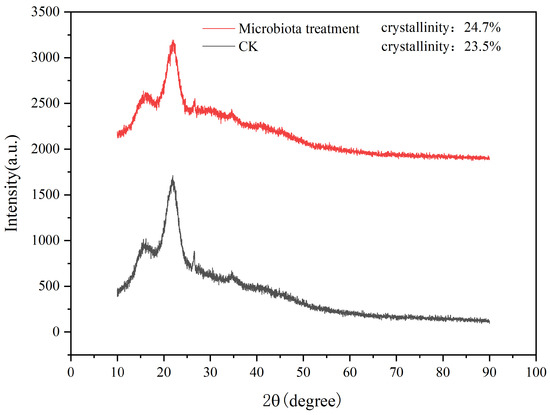 Crystallinity serves as a crucial indicator for assessing the characteristics of cellulose, as it mirrors the extent of crystallization during the cellulose aggregation process [51]. Upon undergoing diverse pretreatments, with the elimination of specific constituents in the straw, alterations occur in both the structure and crystallinity of the straw. The X-ray diffraction (XRD) pattern, as depicted in Figure 9, exhibited main peaks and secondary peaks at 22.0° and 15.0°. These peaks, respectively, demonstrated the diffraction intensity of the crystalline and amorphous regions. Results indicated that after 7 days of fermentation treatment, the crystallinity of the straw control group (CK) was 23.5%, while the crystallinity of the experimental group (microbiota treatment) was 24.7%, exceeding that of the control group. In the course of biodegradation, the cellulase secreted eliminated a certain amount of lignin and a relatively larger quantity of hemicellulose components. This led to an elevation in the cellulose content and, consequently, a substantial augmentation in the overall crystallinity [52], which potentially accounted for this observed phenomenon. The data exhibited in Table 3, with a hemicellulose degradation rate of 64.98% and a lignin degradation rate of 65.85%, could potentially serve as evidence. They also imply that the supplementation of the microbial inoculant had a positive impact on the decomposition of straw.