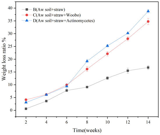 Changes of straw weight loss rate in different treatment samples. B, C, and D denote distinct experimental groups in the indoor simulated straw-returning experiment. B represents Aw soil with added straw, C represents Aw soil added with both straw and the commercial microbial agent Wooboo, and D represents Aw soil added with straw and mixed actinomycetes. Error bars are the standard error (n = 3).