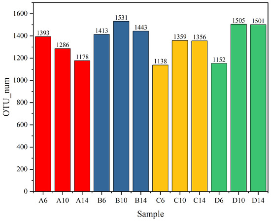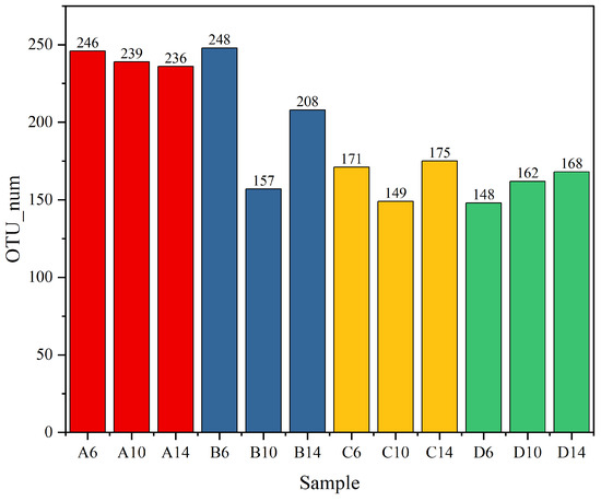 As illustrated in the Figure 11, regarding the soil microorganisms sampled from the albic horizon soil, the bacterial abundance exhibited a gradual decline over the course of time. The quantity of OTUs diminished from 1393 in A6 to 1178 in A14. Subsequent to the incorporation of straw, the bacterial OTUs marginally augmented from 1413 in B6 to 1531 in B10. Nevertheless, by the 14th week (B14), a slight reduction was observed, yet it remained higher than that of A14, attaining 1443. This substantiates that the addition of straw can effectively enhance the soil species abundance [59]. In the experimental group C6 with the supplementation of the commercial microbial agent Woobao, the abundance was inferior to that of the soil in B6, amounting to 1138. This might be attributed to the introduction of dominant microbial communities, leading to nutrient competition. However, the abundance escalated by the 10th week (C10) and stabilized by the 14th week (C14), reaching 1365. Analogous to the experimental group with the addition of the commercial microbial agent, in group D with the addition of the specially prepared actinomycete flora, the bacterial abundances at corresponding time points were all greater than those in group C, with 1152 in D6 and remaining constant at 1501 from D10 to D14. It is particularly noteworthy that when the treatment reached 14 weeks, the species abundance in D14 was the pinnacle among all experimental groups.