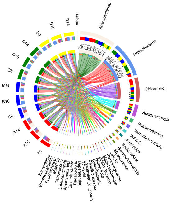 Circos was utilized to illustrate the relationship between samples and species. It can not only reflect the proportion of dominant species within each sample but also show the distribution of different dominant species among various samples. At the phylum level, significant differences in bacterial quantity were observed among different treatments (Figure 13). In the soil blank control groups (A6, A10, A14), Actinobacteria (with a proportion ranging from 31.51% to 52.39%) and Chloroflexi (from 24.51% to 30.95%) were the most abundant microorganisms, and the fluctuations with sampling time (6–14 weeks) were not obvious. After adding straw, notable changes occurred in the dominant microorganisms of the control groups (B6, B10, B14). In the samples collected in the sixth week, Actinobacteria (42.44%), Chloroflexi (24.74%) and Proteobacteria (11.73%) were predominant. In the 10th week samples, their abundances changed significantly. From the 10th to 14th week, the abundance of Proteobacteria increased to 37.31–42.25%, that of Actinobacteria decreased to 21.96–24.94%, and Chloroflexi’s abundance declined to 12.08–14.55%. The laboratory groups (C6, C10, C14) with the addition of the commercial microbial agent “Woobao” differed from the previous control groups. The dominant microbial groups were Proteobacteria (from 32.13% to 54.11%) and Actinobacteria (from 19.21% to 29.06%).