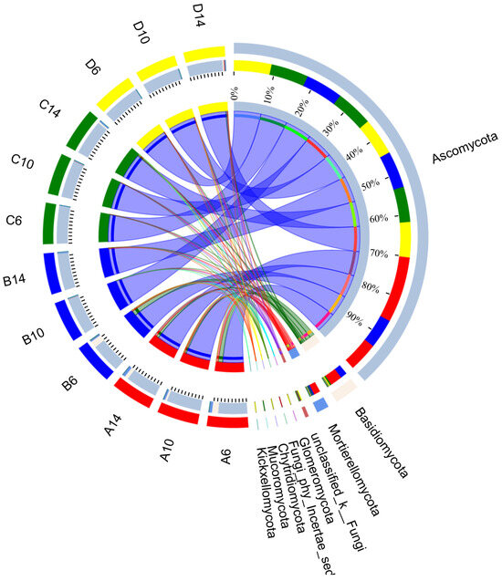 The sample and species relationship diagram, which shows the relative abundance and proportion of Fungi. A, B, C, and D correspond to the experimental groups of indoor simulated straw-returning settings, respectively; 6, 10, and 14 represent different sampling times in weeks.